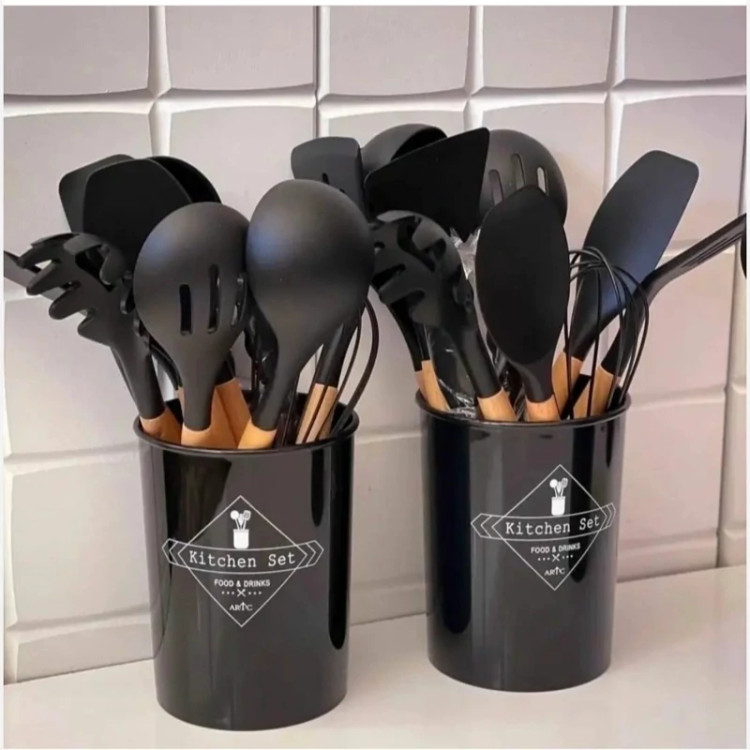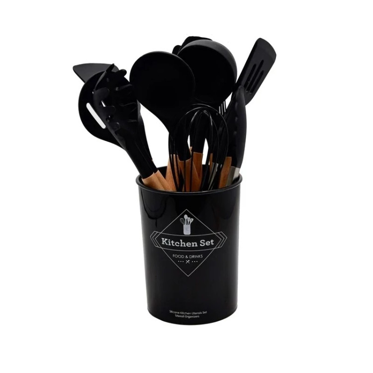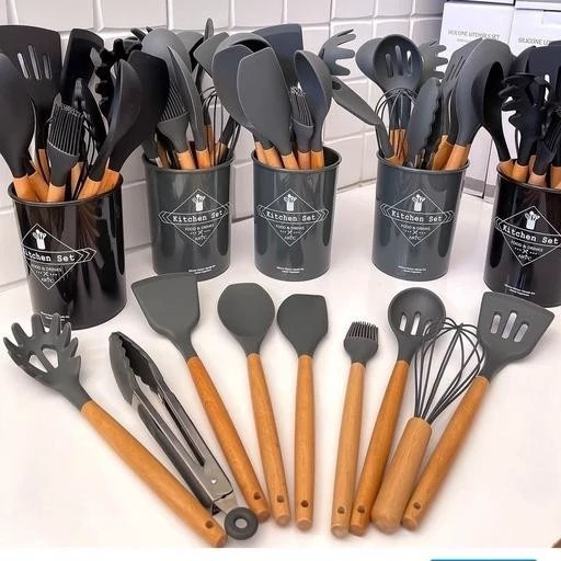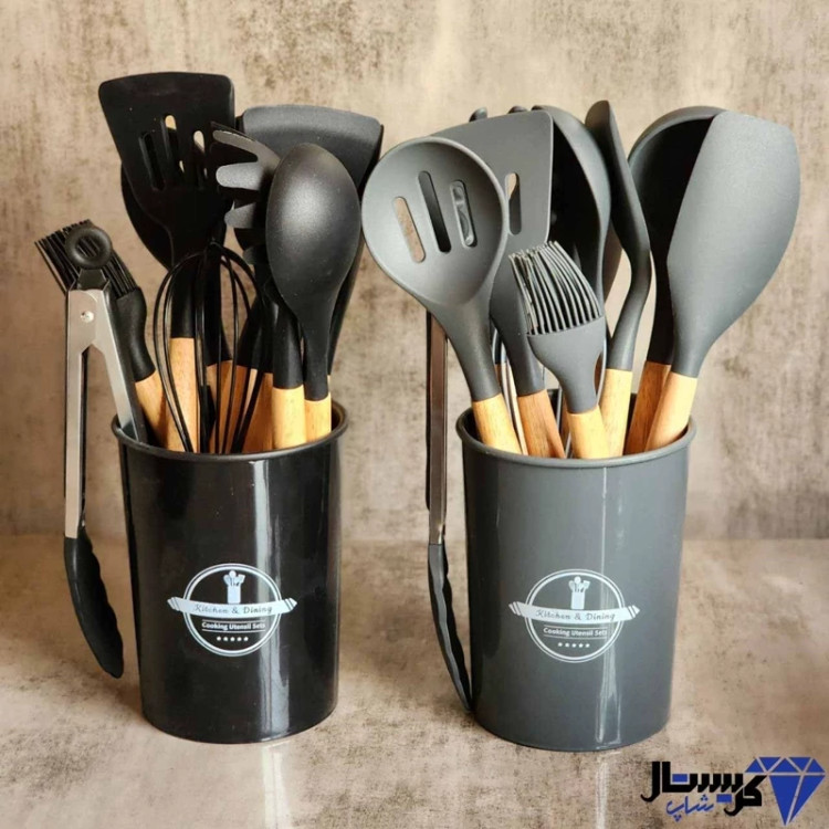 سرویس کفگیر ملاقه و ابزار آشپزی 12پارچه سیلیکونی شامل 11 ابزار و یک پایه سطلی است، که یک سرویس کامل برای هر آشپزخانهای میباشد.دسته این ابزار ها از جنس چوبی بامبو تولید شده است و قطر این دسته ها در حدود 2 سانتی متر است که باعث شده بسیار محکم و خوش دست باشند. سَری این ابزار ها از جنس سیلیکون است. به همین دلیل بهترین گزینه برای آشپزی با ظروف نچسب هستند.