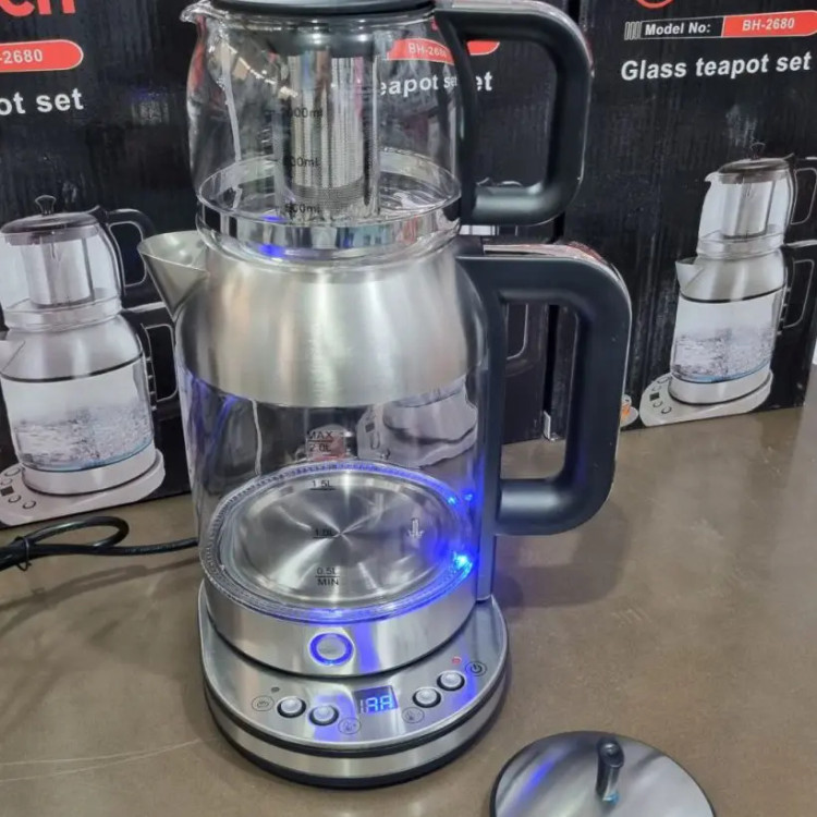 کتری ۲.۵ لیتری قوری ۱.۱ لیتری توان مصرفی 200وات قابلیت تنظیم حرارت و دما دارای کنترل پنل لمسی دارای نور ال ای دی آبی رنگ دسته های پلاستیک و استیل ضد زنگ دارای تفاله گیر مخصوص قوری جنس بدنه از پیرکس مقاومجنس کتری و قوری از پیرکس مقاوم و ضد حرارت ساخته شده است همچنین دسته های کتری و قوری از پلاستیک عایق حرارت بوده و در برابر گرما آسیبی نخواهند دید. بر روی کتری و قوری نشانگر ظرفیت وجود دارد که میتوانید میزان ظرفیت را تخمین بزنید. همچنین دارای دکمه های جهت تنظیم دما و حرارت بوده و بعد از اتمام جوشیدن آب چایی ساز خاموش میشود .