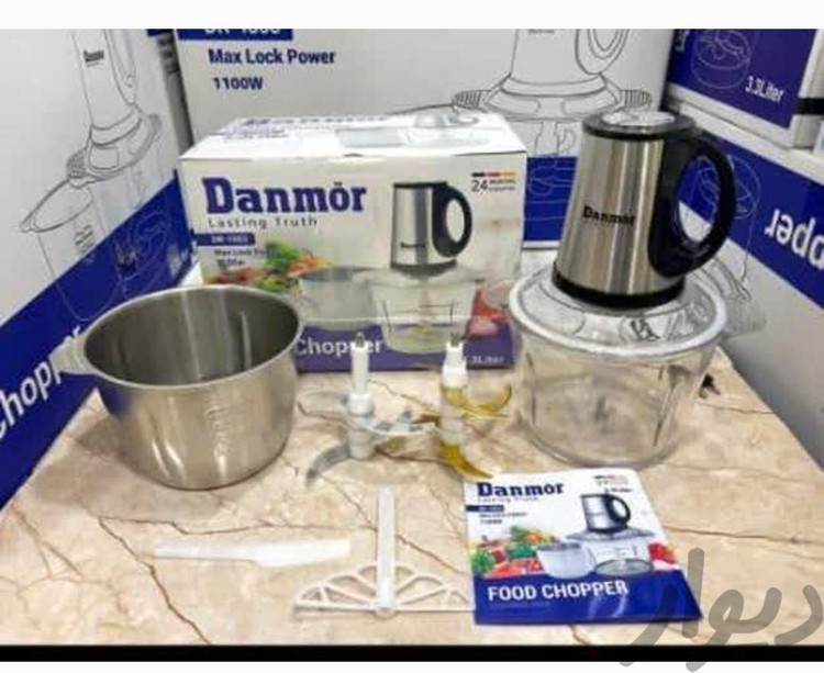 خرد کن و غذا ساز مارک دانمور.دارای دوکاسه پیرکس و استیل.ضرفیت ۳و۳لیتری.۶تیغه طلایی و ۴تیغه یدک.توان 1100وات واقعی.دو سرعته.کیفیت عالی.جنس درجه یک.